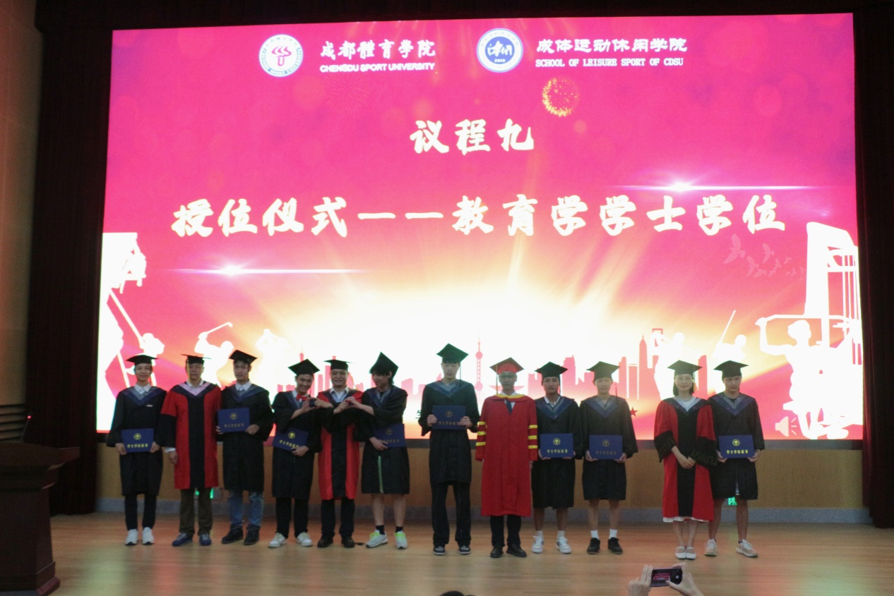 随后,运动休闲院院长曾洪林教授宣读硕士、学士学位授予决定,曾洪林教授、闫虹副教授、蒋书君副教授为获得硕士学位同学授位。曾洪林教授、舒建平教授、闫虹副教授、蒋书君副教授、徐鹏老师上台为获得教育学学士学位同学授位。