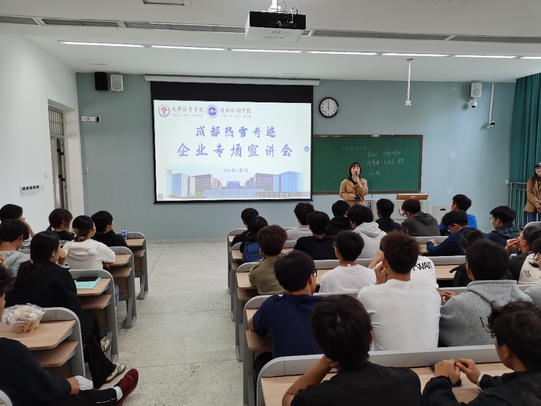 成都热雪奇迹与我院已经合作多年,并共同组建了滑雪队。此次宣讲的目的是在前期合作的基础上,进一步扩大合作内容,在招聘高年级学生的同时,也选拔低年级学生作为储备人才。会上,公司负责人介绍了滑雪场的规模、运营情况,滑雪指导员的培训方式以及未来晋升机制和相关薪资待遇等,并现场回了部分学生的问题。樊莉副书记希望同学们打开视野,本着多学一项技能,就多一份选择的观点,把握机会,积极参与。
