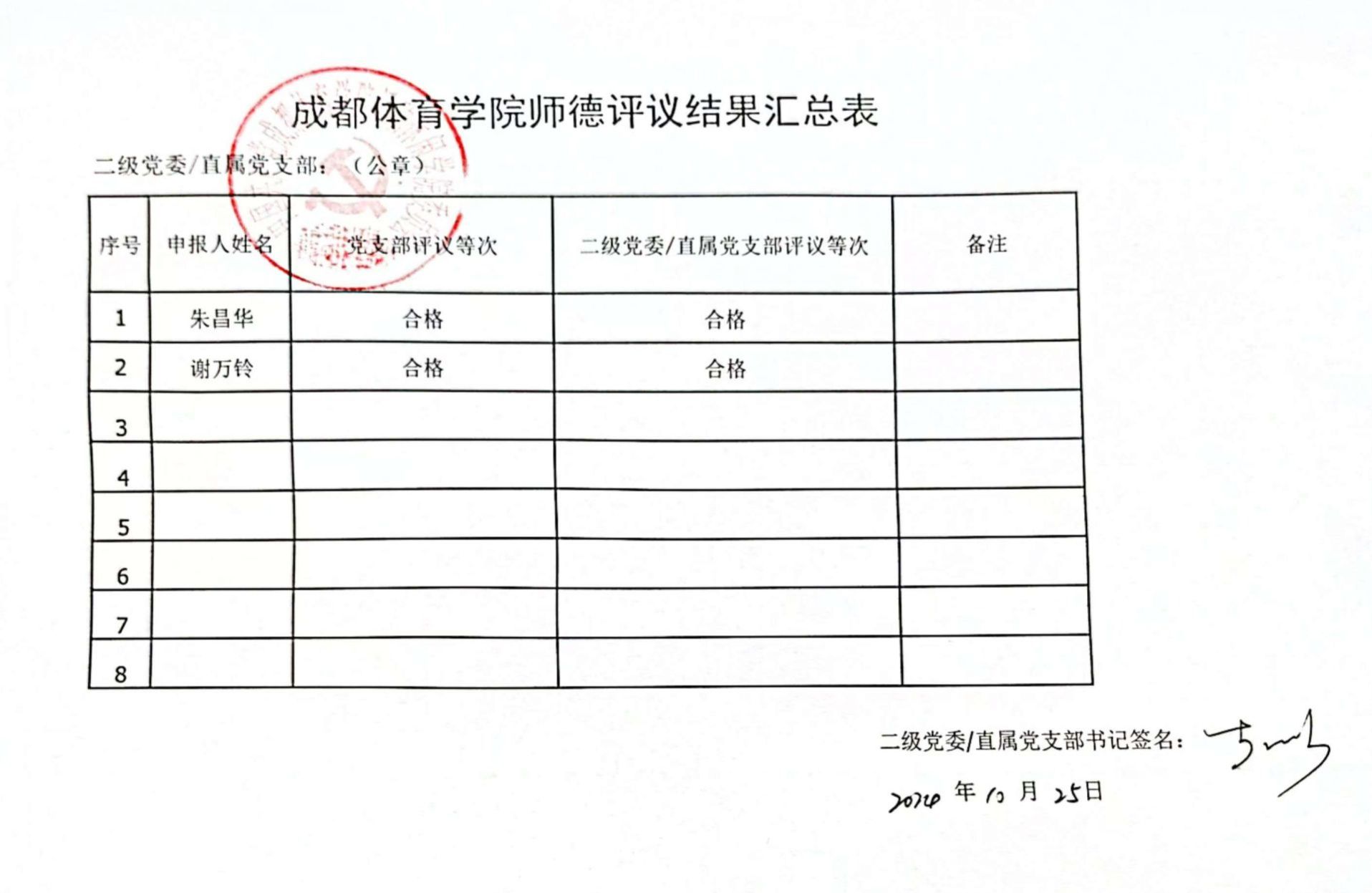 按照学校《关于开展2024年专业技术职务评审工作的通知》规定,运动休闲学院党委于2022年10月25日召开组织会议,依据《四川省高校教师师德考核负面清单》、《成都体育学院建立健全师德建设长效机制实施细则》对朱昌华、谢万铃两位老师开展了师德师风评议,评议结果为合格。现进行公示。
